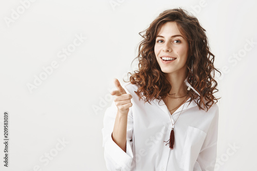 Indoor shot of gorgeous adult european woman in white blouse, pointing at camera with index finger or making gun gesture, smiling broadly and standing over gray background. Hey, I remembered you