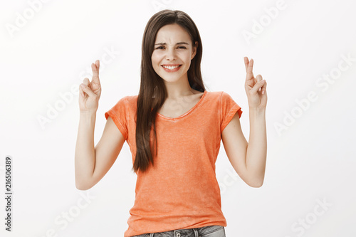 Indoor shot of grinning dreamy girl in casual outfit, raising crossed fingers and smiling with impatiens and hope, wishing for dream come true, praying and expressing positive attitude