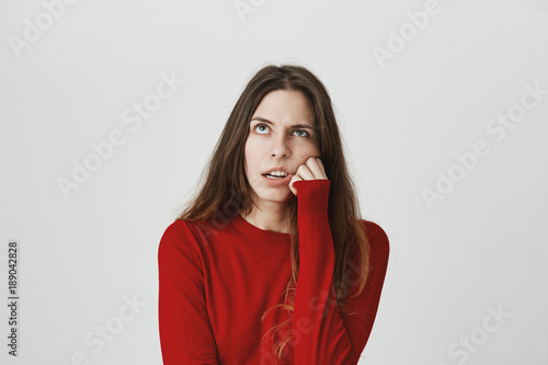 Indoor shot of pretty dark-haired woman making grimace, looking upwards, resting her head on hand, having tired and annoyed expression. Face expression and negative emotions