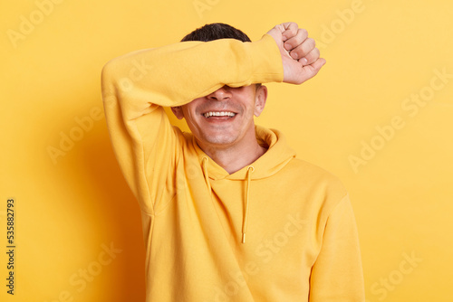 Indoor shot of smiling optimistic brunette man wearing hoodie, covering his eyes with arm, feels shy, expressing positive emotions, posing isolated over yellow background.