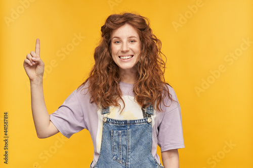 indoor shot of young ginger female wears blue denim overalls and purple t-shirt, pointing with a finger upwards, smiling joyfully with a positive facial expression. isolated over yellow background