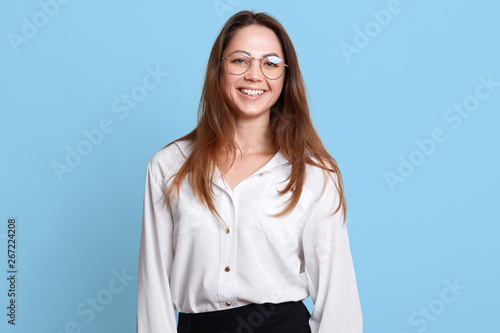 Indoor studio shot of successful cheerful executive standing isolated over light blue background, having positive facial expression, wearing formal office clothing and eyeglasses. Office work concept.