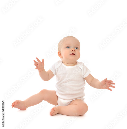 Infant child baby toddler sitting hands up surprised