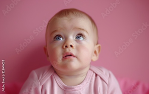 Infant of Mediterranean descent with blue eyes sitting on a pink blanket