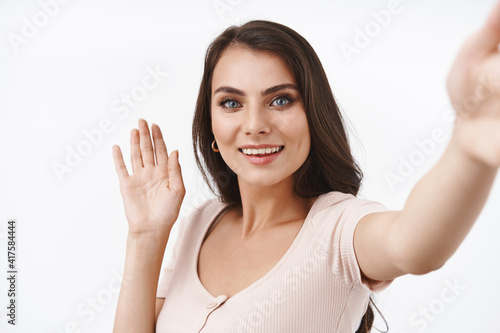 Informal greeting. Charming, smiling pretty woman saying hi, talking with family via internet online video messanger, waving hand saying hello, hi, holding smartphone, taking selfie, white background