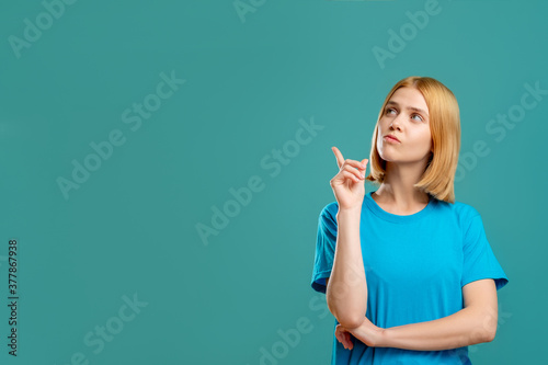 Inspired woman portrait. Answer solution. Pensive blonde lady in blue t-shirt looking pointing at empty space for logo text isolated on teal promotional background. Insight idea.