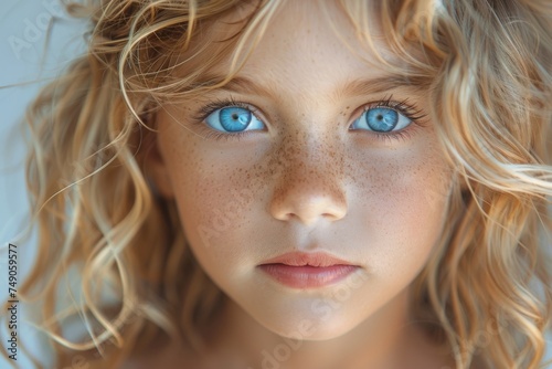 Intense close-up of a little girl with vivid blue eyes, golden curls, and freckles indoors