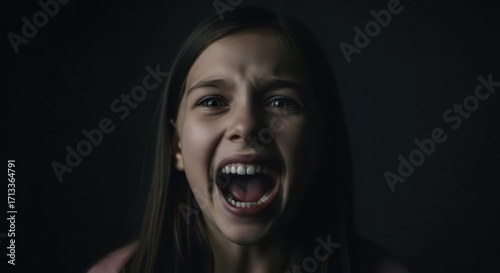 Intense portrait of a young girl screaming in distress conveying profound fear and angst