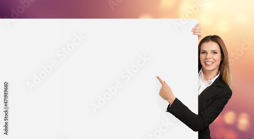 Intresting Offer. Happy Casual Woman Peeping Out The Side Of White Advertisement Board