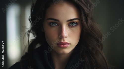 Intriguing Gaze: A captivating portrait of a young woman with long, dark hair and striking green eyes. Her expression is both alluring and enigmatic, drawing the viewer in.