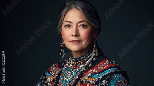 Inuit Woman in Traditional Attire: Portrait of a 50-Year-Old with Black Hair and Inuit Sun Ruff Clothing