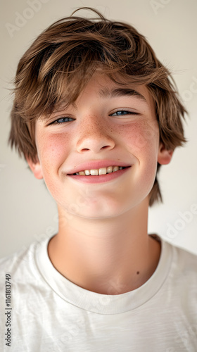 Inviting portrait of smiling Caucasian teenage boy on clean backdrop with warm lighting