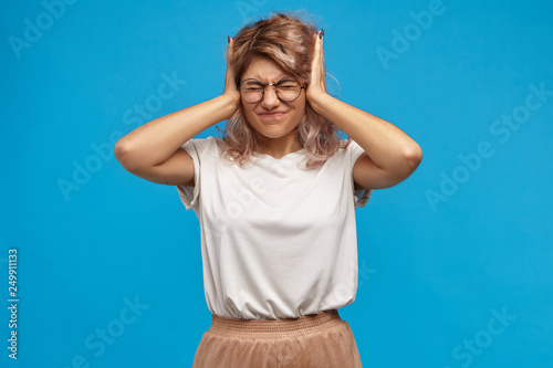 Irritated angry female hipster in trendy eyewear covering ears with hands and screwing eyes being annoyed with squeaky sound or loud music. Frustrated teen girl can't stand her parents fighting