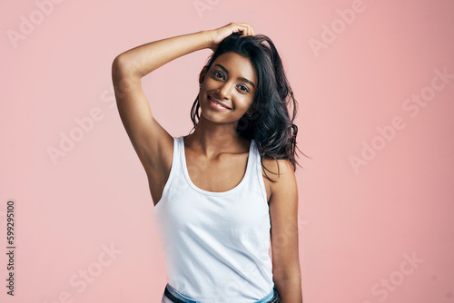 Isnt she lovely. Studio portrait of a beautiful young woman posing with her hand in her hair against a pink background.