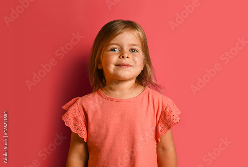 Isolated closeup portrait of happy little girl on pink background, emotional headshot of a proud and smiling child