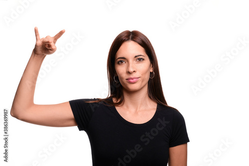 Isolated in white background brunette woman saying dream in spanish sign language