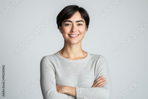 Isolated over white background, a smiling, confident young woman in long sleeves stands with arms crossed. She looks successful