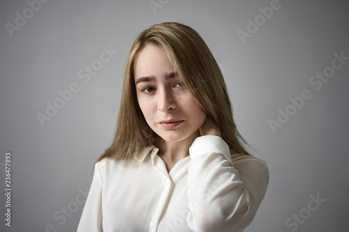 Isolated picture of thoughtful serious young Caucasian blonde woman dressed in silky white shirt touching her neck, being frustrated or worried about some project at work, looking at camera