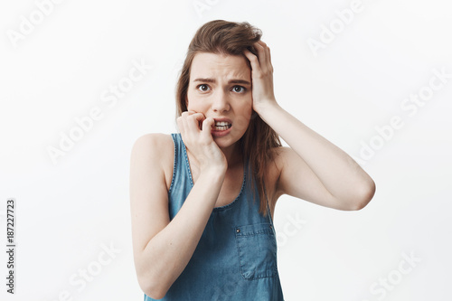 Isolated portrait of beautiful unhappy young caucasian student girl with dark long hair gnawing hands, holding forheand, looking aside with scared expression. Girl being frightened of horror movie in