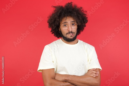 Isolated portrait of stylish young European man bitting his mouth and looking worried and scared crossing arms, worry and doubt.