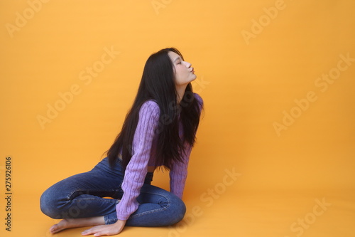 Isolated shot of pretty Beautiful Asian models over pink background for advertising concept , wears casual outfit, being entertained by friend during party