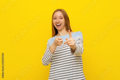 Its you. Beautiful young woman with fair-haired, pointing fingers at camera and smiling, choosing, inviting people, recruiting, standing over yellow background
