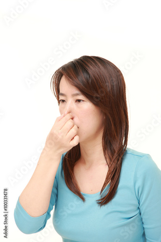Japanese woman holding her nose because of a bad smell