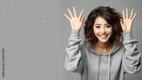 Japanese woman smiling in casual apparel with welcome gesture greeting isolated