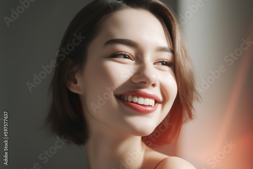 Jovem sorridente com dentes brilhantes, pele facial perfeita e ombro olhando de lado,