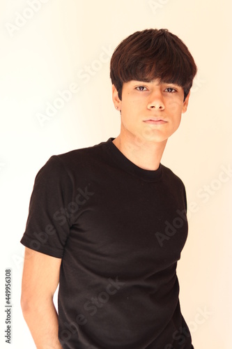 Joven latino de cabello oscuro de pie fondo claro con camiseta negra