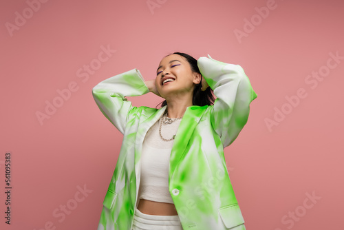joyful asian woman in green and white jacket touching hair and posing with closed eyes isolated on pink.
