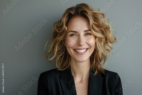 Joyful Businesswoman in Studio gray background
