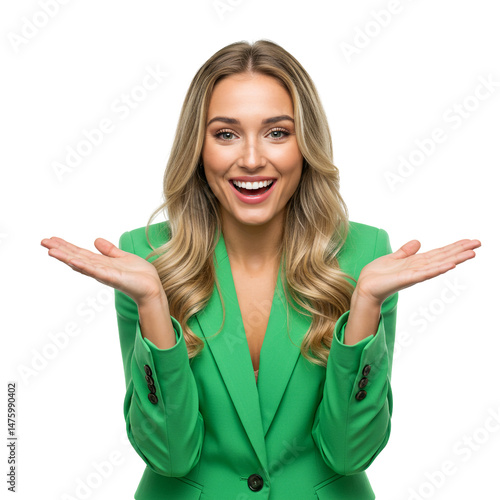 Joyful Caucasian Female Leader Showing Direction with Open Palms Upward Portrait Smiling Indicating Presenting Guiding Businesswoman