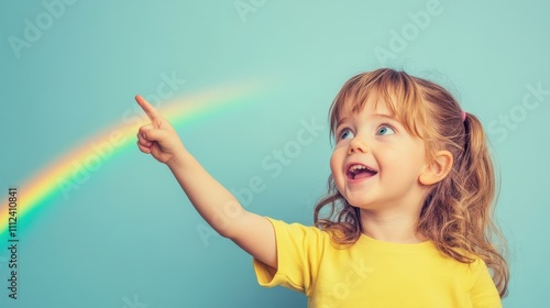 Joyful Child Excitedly Pointing at a Colorful Rainbow Against a Soft Blue Background