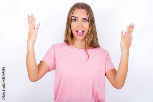 Joyful excited lucky beautiful blonde girl wearing pink t-shirt on white background cheering, celebrating success, screaming yes with clenched fists