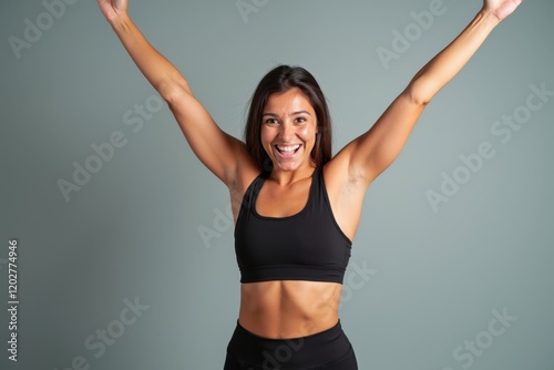 Joyful Fitness Enthusiast Celebrating Health and Vitality with Outstretched Arms in a Modern Workout Studio Setting