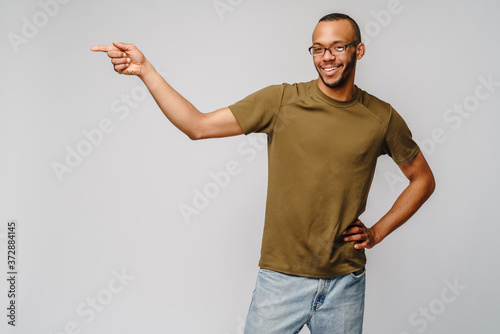 Joyful friendly african-american young man in green t-shirt pointing by finger at copy space