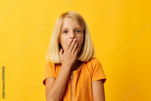 joyful girl with blond hair gesturing with her hands