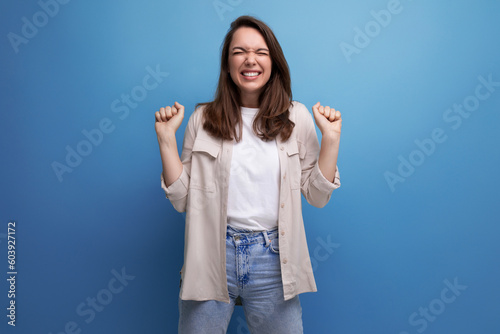 joyful happy young dark-haired lady in informal clothes celebrating victory on blue background