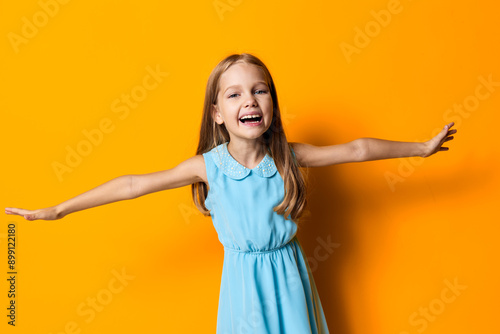 Joyful little girl in a blue dress with arms wide open on a vibrant orange background, celebrating happiness