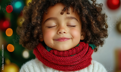 joyful little girl with curly hair smiles with her eyes closed, wearing cozy red scarf and white sweater, surrounded by festive decorations