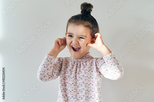 joyful, mischievous funny emotions on the face of a young little white girl with the hair gathered on top. Close-up portrait on white background