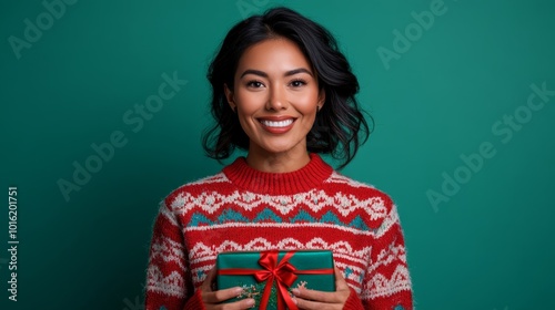 Joyful Native American woman in a festive sweater holding a Christmas gift on a green-to-blue gradient background
