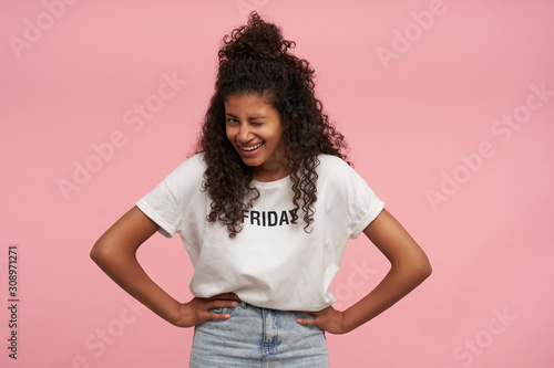 Joyful pretty young curly brunette lady with dark skin holding hands on her waist and laughing happily, giving wink to camera while standing over pink background