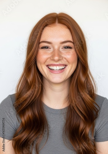 Joyful Redhead Woman Portrait - A cheerful young woman with long, wavy auburn hair smiles brightly. The conveys happiness, confidence, youth, and natural beauty.