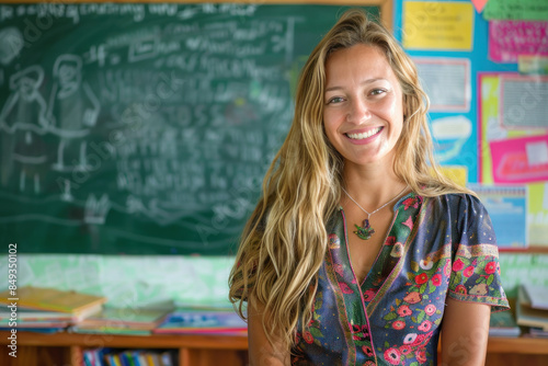 "Joyful Teacher in Classroom Portrait", Professional Environment, Diverse Workforce, Corporate Photography, Team Collaboration, Engaged Employees, Authentic Work Settings.