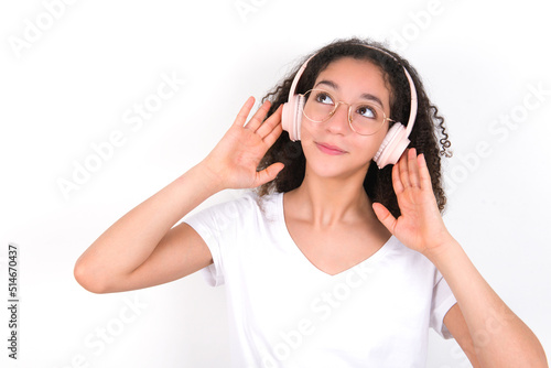 Joyful Teenager girl with afro hairstyle wearing white T-shirt over white wall sings song keeps hand near mouth as if microphone listens favorite playlist via headphones