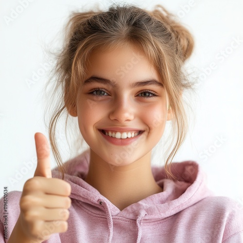 Joyful teenager giving a thumbs-up, expressing confidence and positivity, vibrant energy radiating from her warm smile