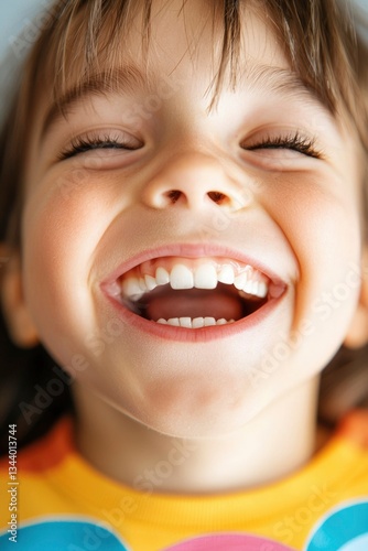 Joyful toddler girl laughs happily, eyes closed, a close-up indoor portrait