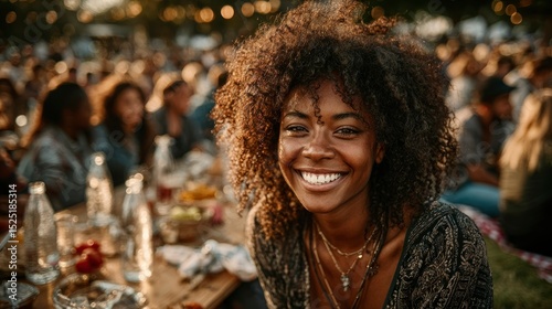 Joyful Woman at a Festive Outdoor Gathering with Friends and Food